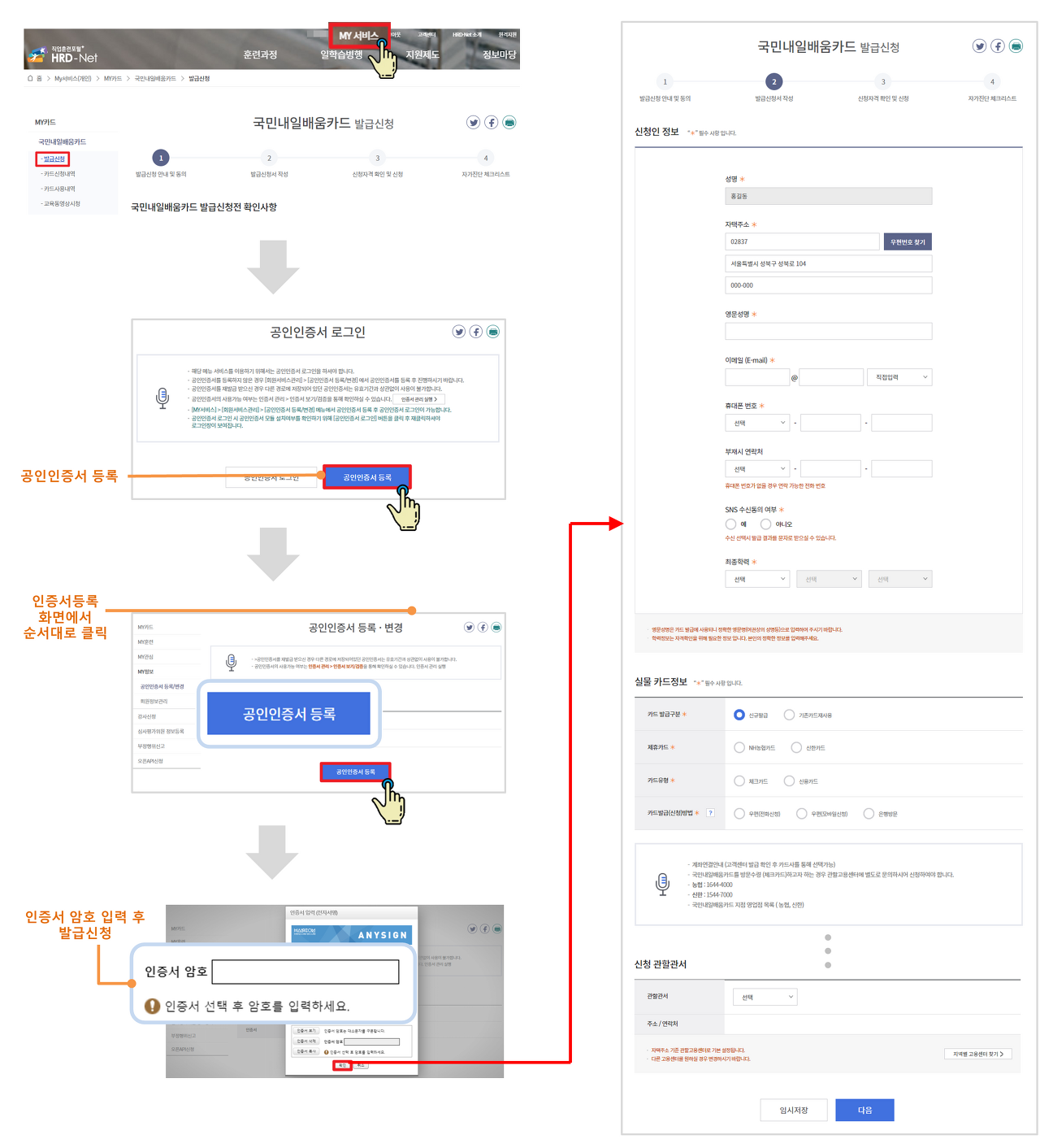 - HRD-Net 홈페이지 로그인 후 나의 정보 페이지에서 나의 카드 > 국민내일 배움 카드 > 발급 신청으로 이동하기.